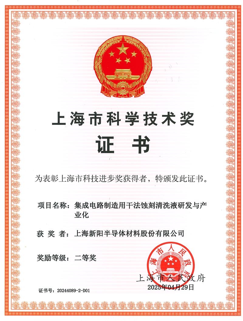 2025年8月26日,上海市科技大会暨科学技术奖励大会隆重召开,会上正式揭晓2024年度上海市科学技术奖评选结果。上海新阳半导体材料股份有限公司自主研发的“集成电路用干法蚀刻清洗液研发与产业化”项目,凭借显著的技术创新性与产业应用价值,荣获2024年度上海市科学技术进步二等奖。在本年度评选出的97项科学技术进步奖中,上海新阳是唯一以第一完成身份获奖的半导体材料企业。这一荣誉不仅是对公司研发实力的高度认可,也为正处于快速发展阶段的我国半导体产业注入了新的动力。